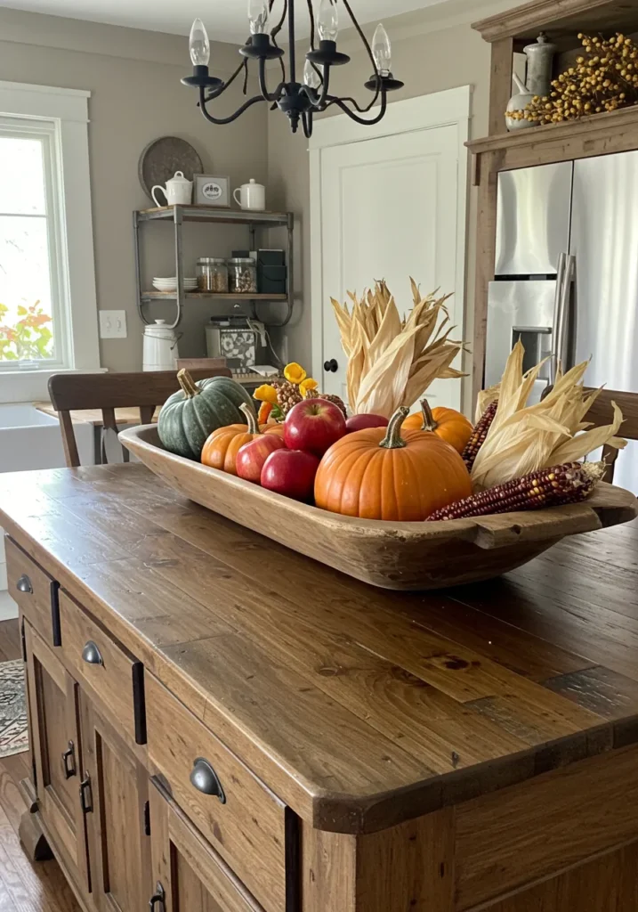 A rustic wooden island is topped with a long dough bowl filled with pumpkins, apples, dried corn, and husks. The mix of natural colors and textures ties beautifully with the farmhouse cabinetry.