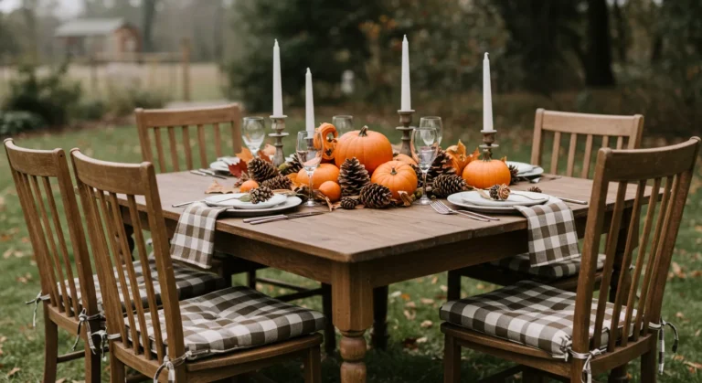 This setup makes me want to gather my friends right away. The plaid seats are such a clever rustic detail, and the mix of pinecones and pumpkins feels both woodsy and festive.