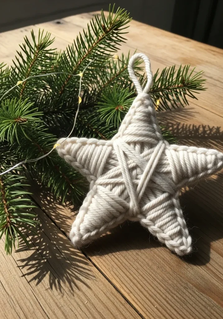 This simple cream-colored yarn star has that charming handmade look that never goes out of style. Resting on a rustic wooden table beside fresh pine sprigs, it gives off a relaxed, natural vibe. The way the yarn crisscrosses around the star shape adds a bit of texture and depth, while the sunlight brings out every soft fiber.