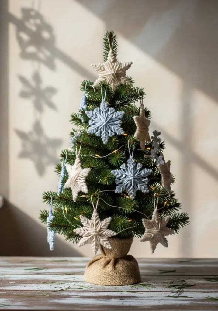 This small Christmas tree looks so cozy and charming with its soft yarn star ornaments in cream and light gray tones. The stars hang beautifully against the green needles, catching the sunlight and casting lovely shadows on the wall behind. The burlap base gives it a natural, rustic touch.