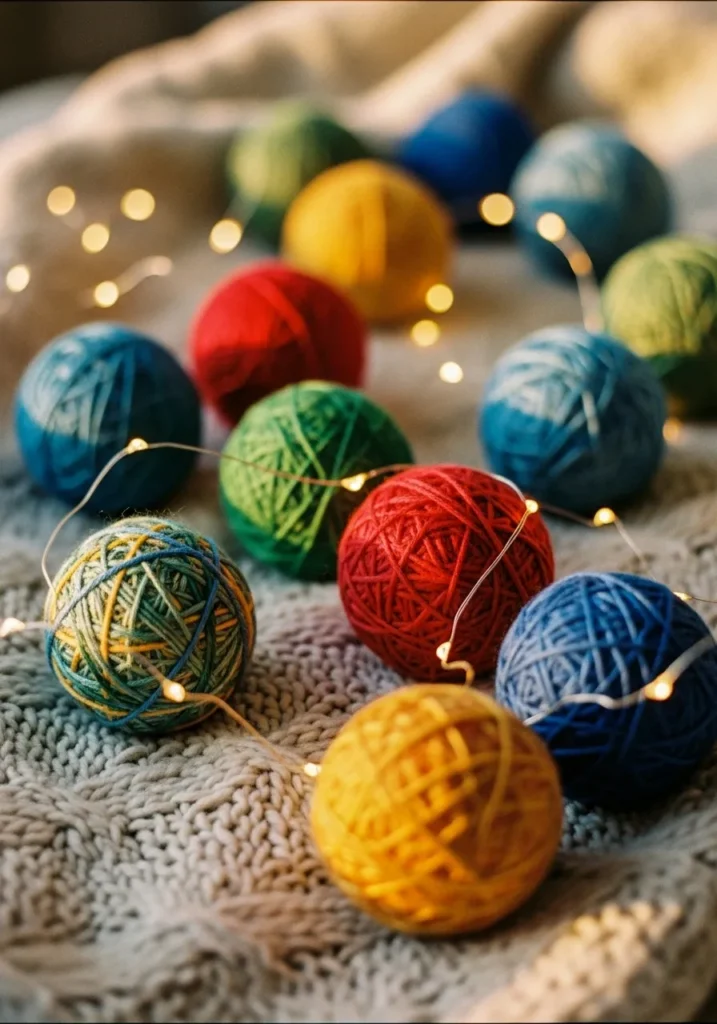 Here’s proof that even yarn can sparkle. Brightly colored yarn balls in red, green, yellow, and blue are scattered across a knitted blanket, with fairy lights weaving through them. The soft glow of the lights makes the whole scene feel whimsical and joyful.
