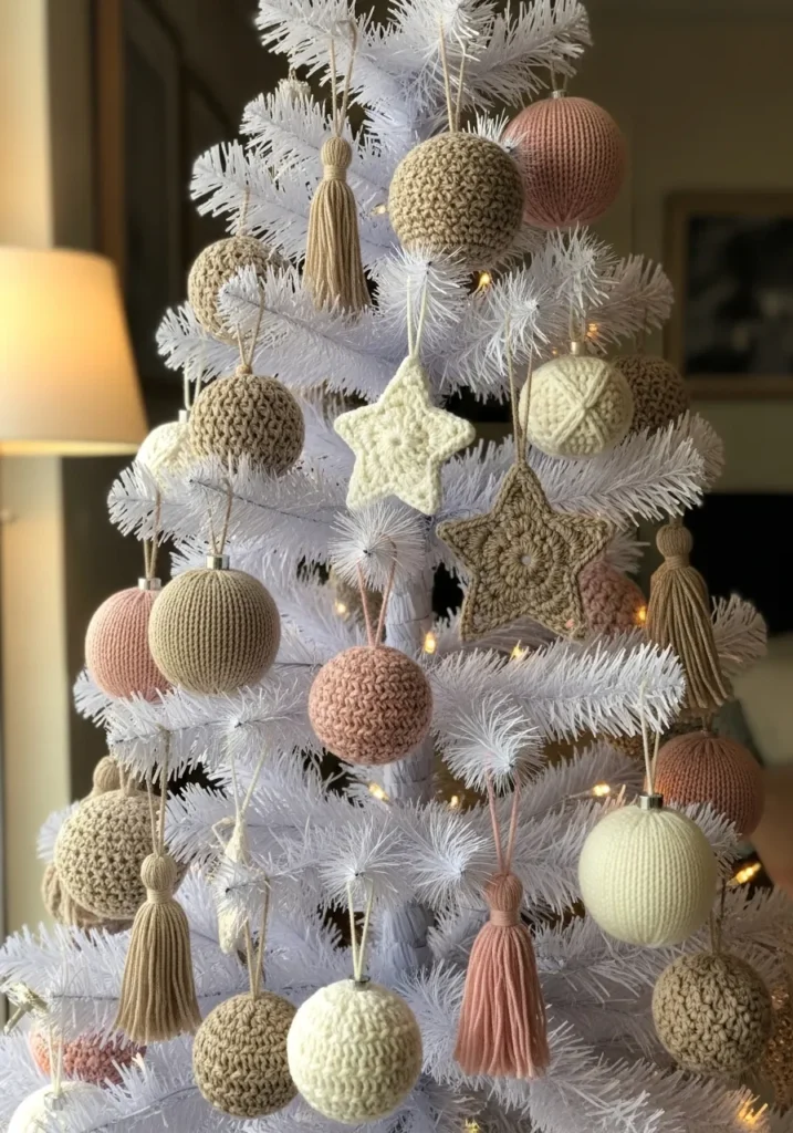 This tree feels like it belongs in a cozy Scandinavian cabin. The white branches are covered with soft, neutral ornaments in shades of beige, blush, and cream. Stars, tassels, and baubles all blend beautifully to create a calm, elegant look.