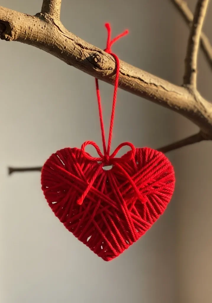 This bright red yarn heart hanging from a simple branch feels both sweet and symbolic. The texture of the yarn catches the sunlight beautifully, and the tiny bow at the top gives it a handmade charm that feels heartfelt and personal.