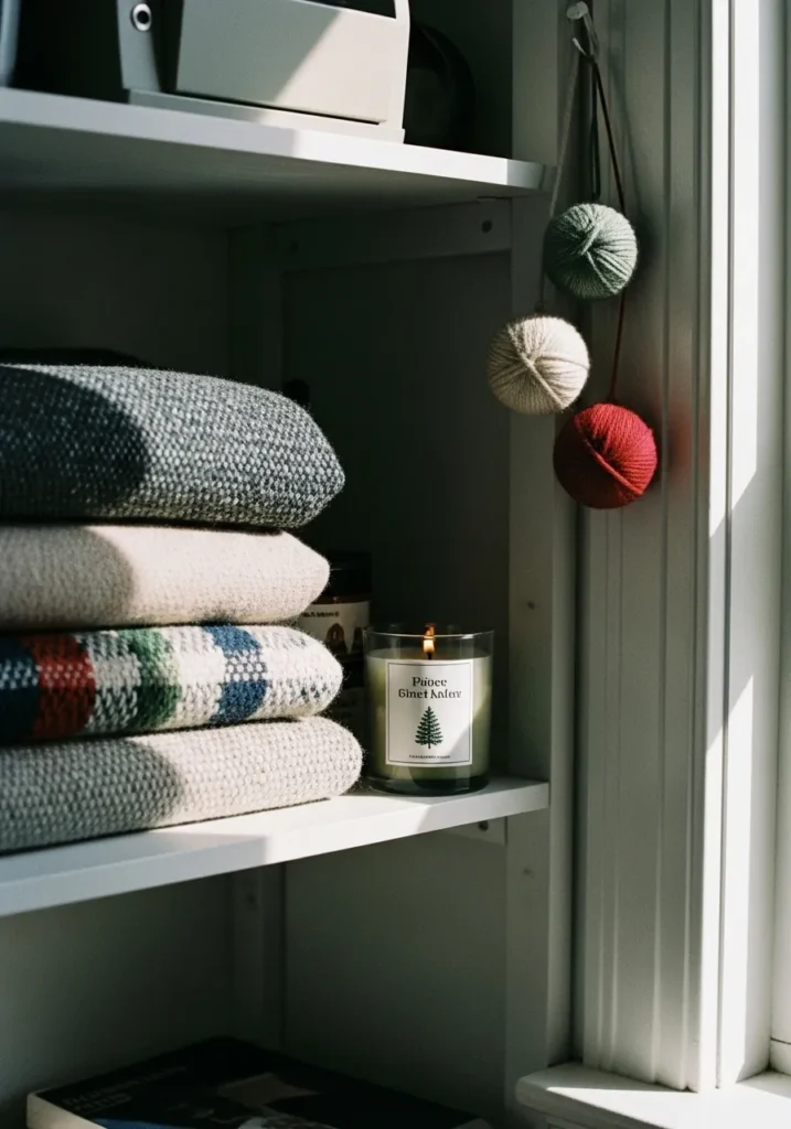 This little shelf feels like the definition of quiet comfort. Stacked blankets, a softly flickering candle, and a trio of yarn ball ornaments hanging nearby make it the perfect cozy nook. The warm afternoon light adds a peaceful glow to the whole scene.