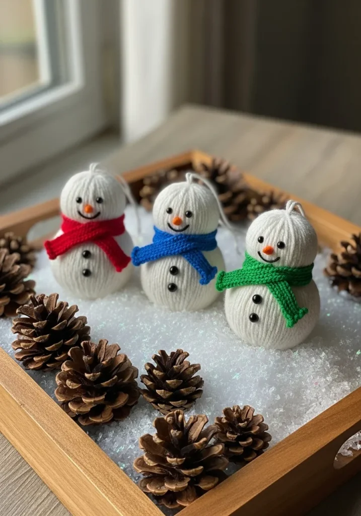 These tiny yarn snowmen look like they’re straight out of a winter fairy tale. Each one wears a colorful knitted scarf—red, blue, and green—that adds just the right pop of cheer against their soft white yarn bodies. The pinecones around them make the setup even cozier, and the gentle sparkle from the faux snow ties it all together perfectly.