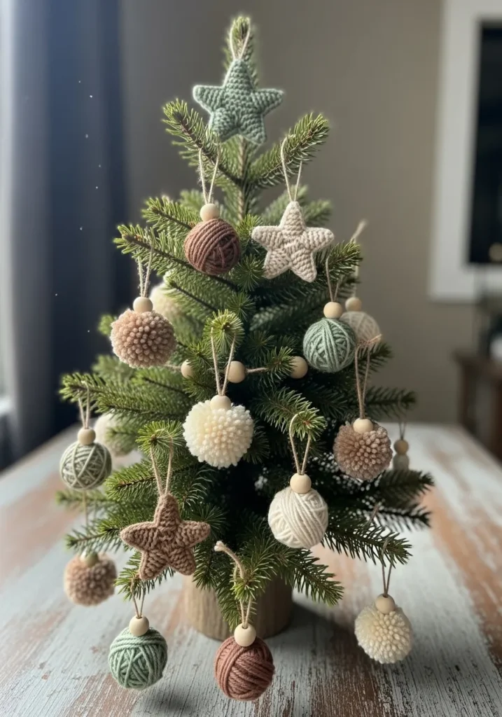 This little Christmas tree captures the essence of cozy minimalism. Soft yarn ornaments in cream, brown, and sage tones hang delicately from the branches, mixing pom-poms, stars, and wrapped balls for texture and variety. The wooden beads add a natural touch that ties everything together beautifully.