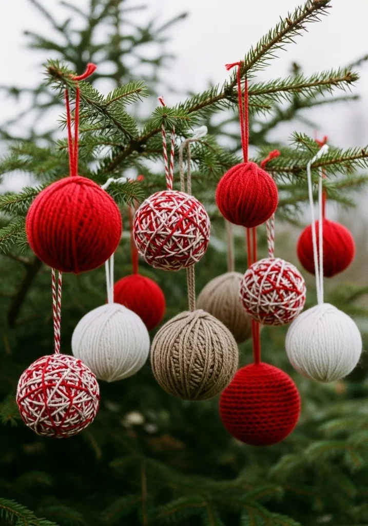 These yarn ball ornaments are the definition of cozy Christmas charm. The mix of red, white, and beige yarn gives them a timeless, homespun look, and they hang so beautifully from the green branches. The knitted texture adds warmth to the greenery and feels inviting even from afar.