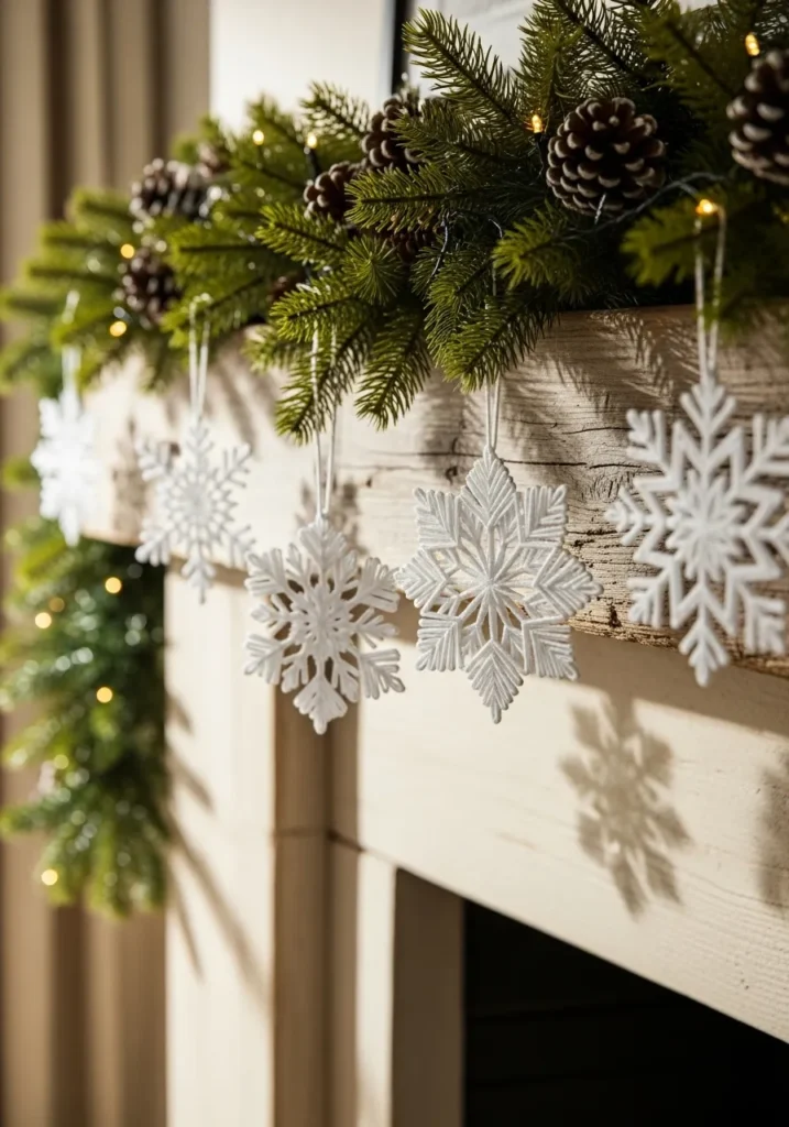 This garland of white yarn snowflakes hanging across a rustic mantel is pure winter magic. The snowflakes look soft and delicate, while the greenery and pinecones above add texture and warmth. Soft fairy lights peek through, creating a glow that feels both simple and elegant.
