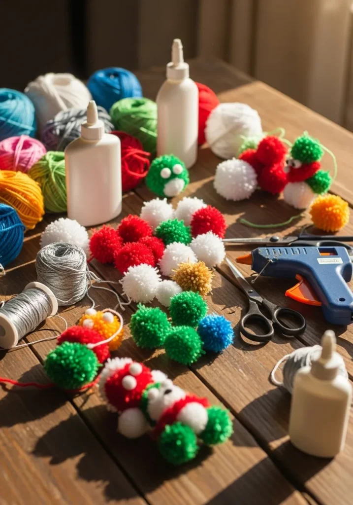 This cheerful craft table looks like a creative Christmas wonderland. Bright yarn balls in every color sit beside pom-poms, glue, and scissors, all basking in the sunlight. The playful pops of red, green, and gold make the whole setup feel fun and full of holiday spirit.