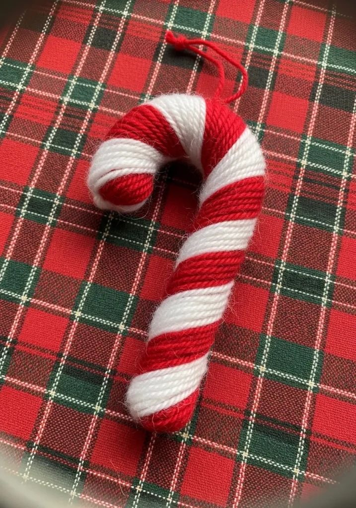 This red and white yarn candy cane brings classic holiday vibes with a soft, handmade twist. The pattern is bold and festive, and the cozy texture makes it stand out against the plaid background. It looks like something straight out of a nostalgic Christmas memory.