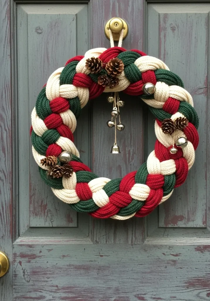 This braided yarn wreath feels like a cozy hug for the front door. The chunky strands of red, green, and cream yarn weave together beautifully, accented by pinecones and little silver bells. It has that handmade charm that feels timeless and festive.
