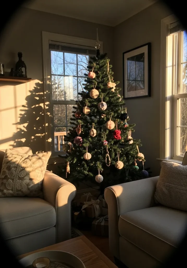 This cozy living room feels so peaceful with its simple Christmas tree decked out in soft yarn ornaments. The golden afternoon light spilling through the windows gives everything a warm, homey glow. Neutral furniture and knit-textured pillows make the space feel extra inviting, while a few neatly wrapped gifts under the tree complete the calm, cozy scene.