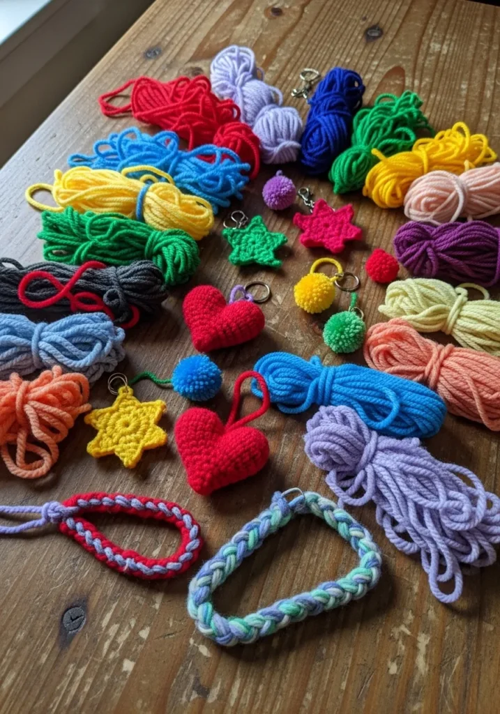 This cheerful scene is bursting with color and creativity. Balls of yarn in every shade imaginable are spread across the table, surrounded by handmade stars, hearts, and pom-poms. The mix of textures and tones feels so playful and full of holiday energy.