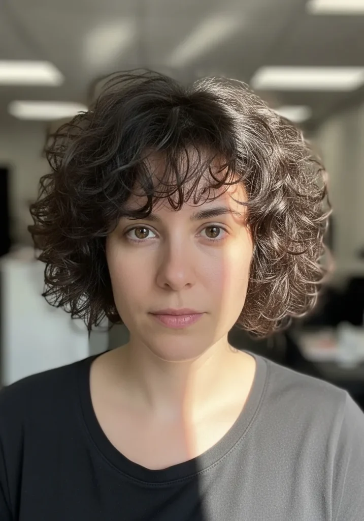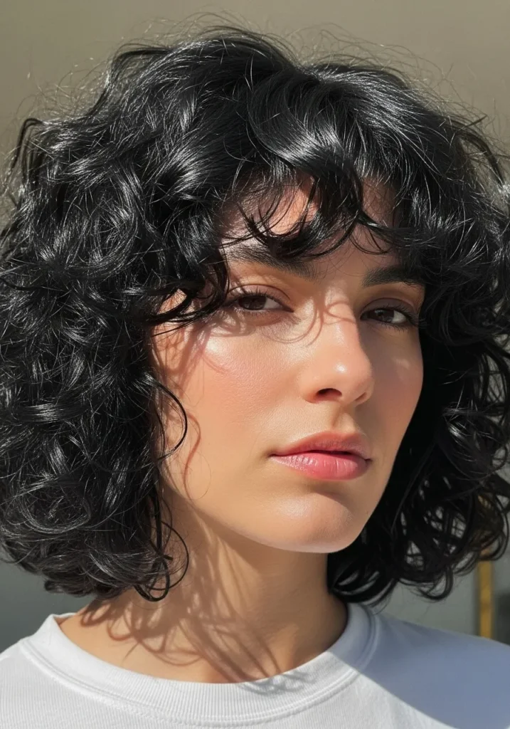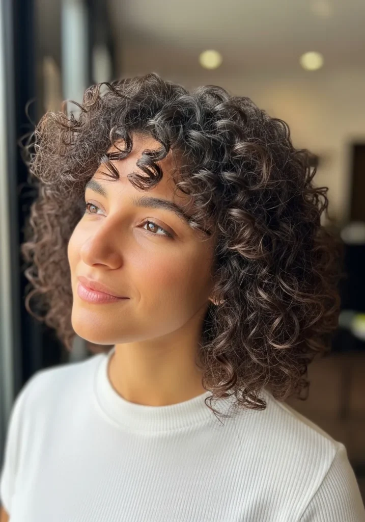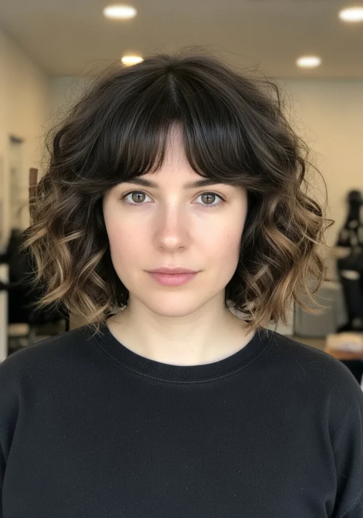This curly bob sits just above the shoulders and has the perfect mix of airy texture and gentle structure. The curls are loose and tousled with a natural bounce that feels effortless. Soft bangs skim the eyebrows and blend seamlessly into the rest of the cut. The color stays rich and deep at the roots then shifts into subtle warm highlights through the ends. Everything about this style feels light, lifted and softly rounded.