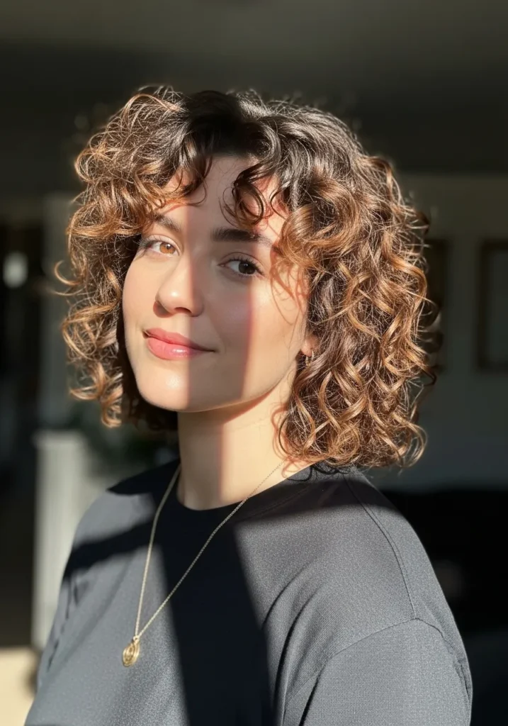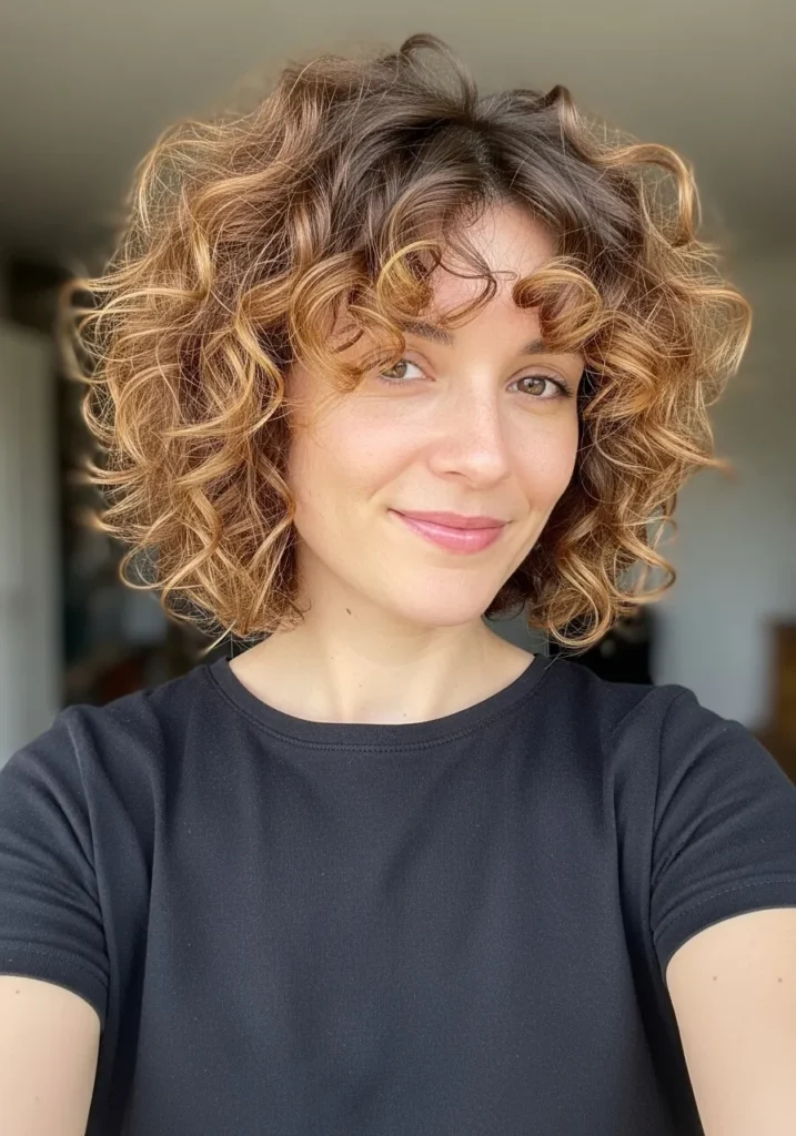 This curly bob sits just above the shoulders with a gorgeous mix of tight spirals and soft ringlets that catch the light in the prettiest way. The shape feels airy thanks to gentle layering that lifts the curls without making them look too puffy. Warm caramel highlights swirl through the darker base and make each curl stand out like its own little moment. The soft curly fringe adds an easygoing touch that frames the face without feeling heavy or blunt.