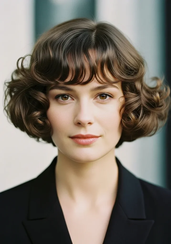 I love how this kind of curl pattern softens a square face. The rounded volume gives the edges of the jaw a gentler feel and the shorter bangs create a pretty vertical line that balances strong angles. I always feel like curls placed this way make the whole face look more relaxed and approachable. It is one of those styles that feels chic without trying too hard and it brings out a lovely softness around the eyes and cheekbones.