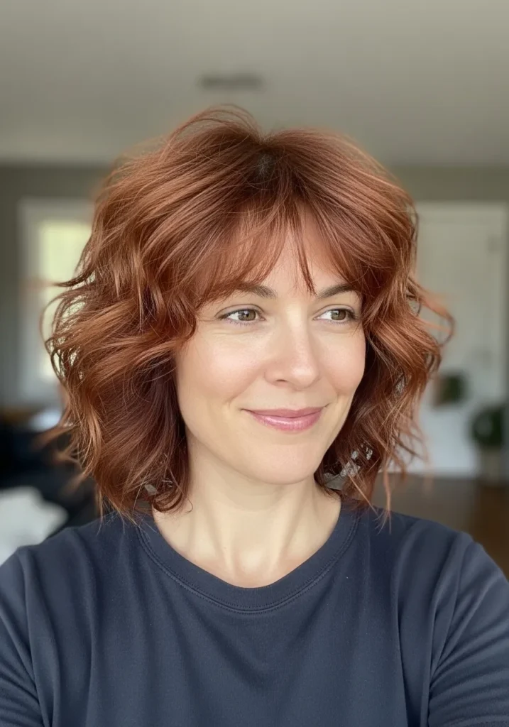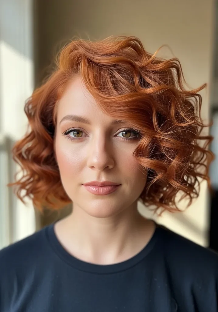 I love how this kind of curl pattern softens a square face because the volume curves outward in all the right places. The curls blur those sharper edges and give everything a gentle frame that feels fresh and feminine. I always notice how copper shades add an extra layer of glow too and it almost tricks the eye into seeing a softer jawline. It just feels flattering in the easiest, most effortless way.