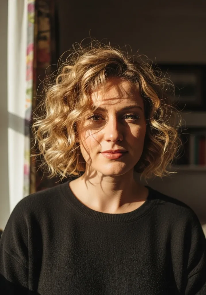 I love how this kind of curl pattern makes my face look instantly softer. The way the curls fall around the jawline takes the edge off sharper angles and gives everything a slightly lifted feel. It is the kind of bob that feels playful yet polished and it makes me look refreshed even on the days when I am absolutely not trying.
