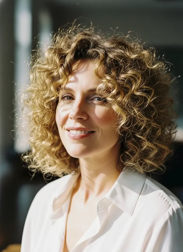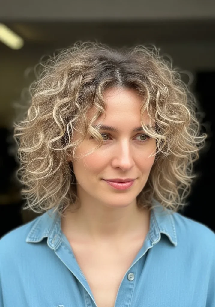 This look shows a shoulder-skimming curly bob with a relaxed middle part that feels effortlessly natural. The curls are loose and bouncy with soft bends that frame the face in the sweetest way. Warm honey highlights brighten the darker base and make the texture pop while subtle layering keeps everything airy rather than bulky. The overall style feels polished but still wonderfully easygoing which is exactly why curly bobs are having such a moment.