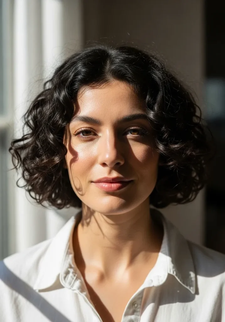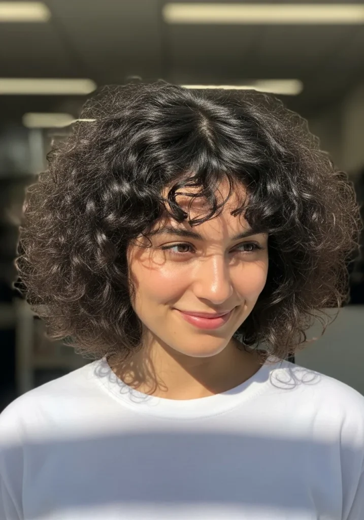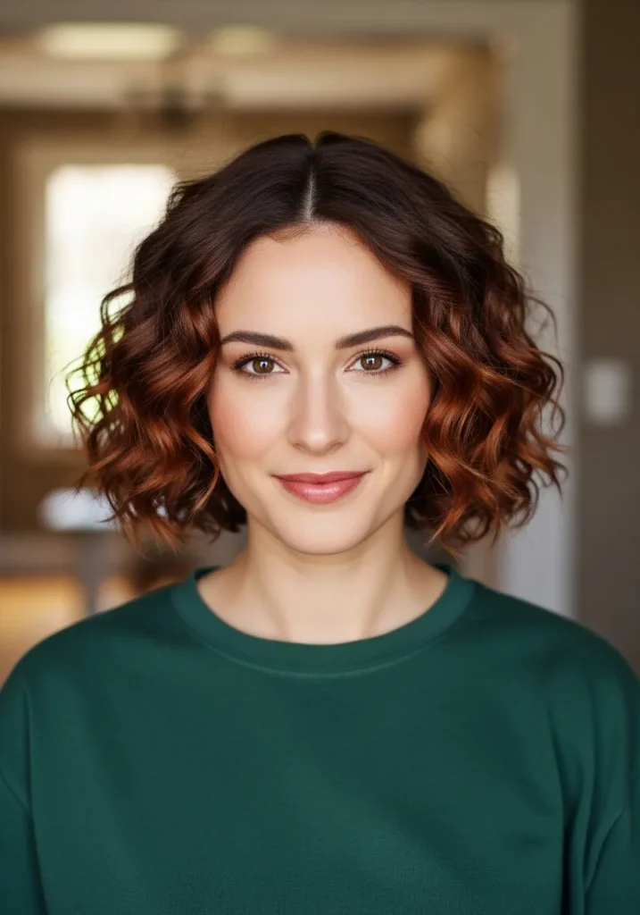 I love how this kind of curly bob makes me feel instantly put together without even trying. The middle part keeps everything symmetrical while the soft curls add a playful bounce that never looks overdone. It’s the kind of haircut that works on busy days when I just want my hair to look cute with minimal effort.