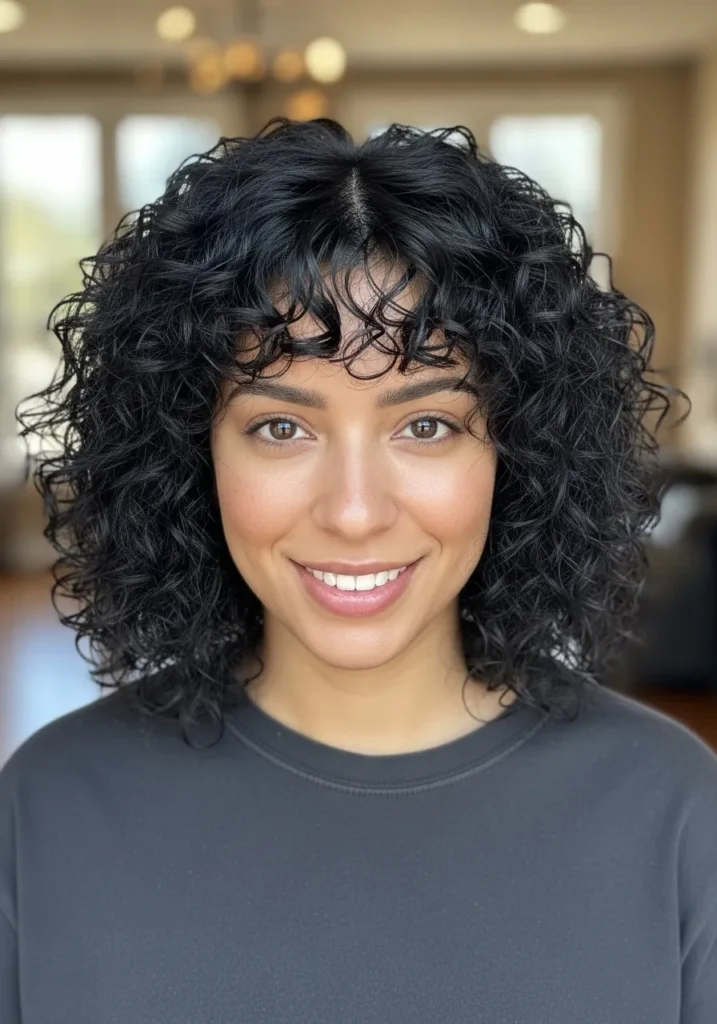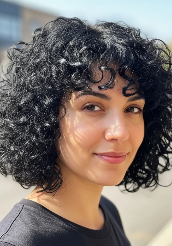 This style is all about bouncy curls shaped into a classic bob that sits right above the shoulders. The middle part gives everything a clean and balanced look while the wispy little bangs in front soften the whole vibe. The curls are tight and springy with a defined texture that makes the cut feel full and lively. The deep black color adds shine and drama and the light layering keeps the curls from feeling heavy or bulky.