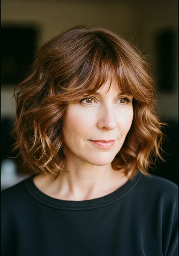 I love how this kind of cut instantly brightens my face without needing much effort. The middle part keeps it polished while the curls bring all the fun. The wispy bangs make it feel playful and flattering especially on days when I want something cute but not fussy. It is one of those styles that makes me feel put together even if I am only wearing a simple top.