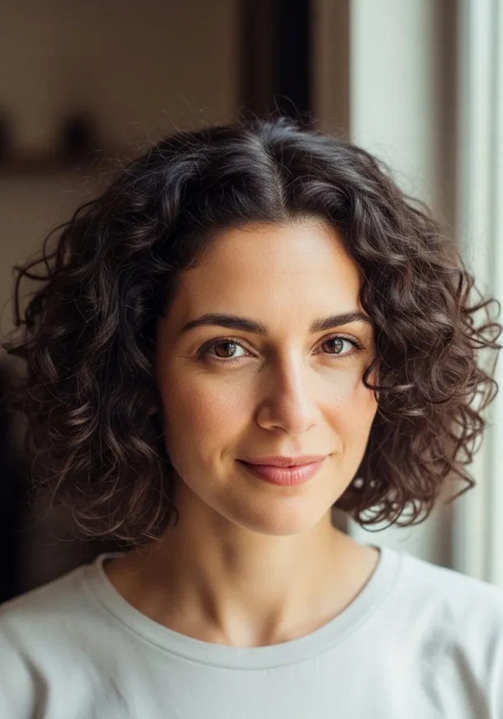 This look features a softly rounded curly bob that sits just above the shoulders with a clean middle part that feels relaxed and easy. The curls are tight enough to give bounce yet loose enough to look naturally undone. The shape has gentle layering that keeps everything airy without taking away fullness. The rich brunette color adds warmth and dimension which makes the curls look even more defined. The overall vibe is effortless and light with just the right amount of volume framing the face.