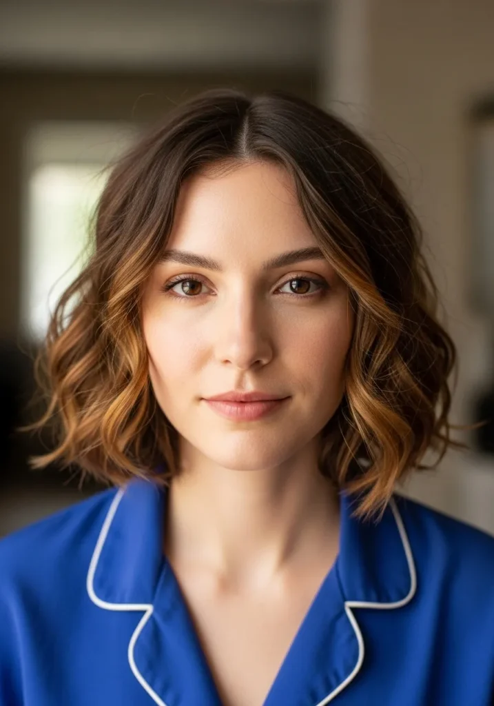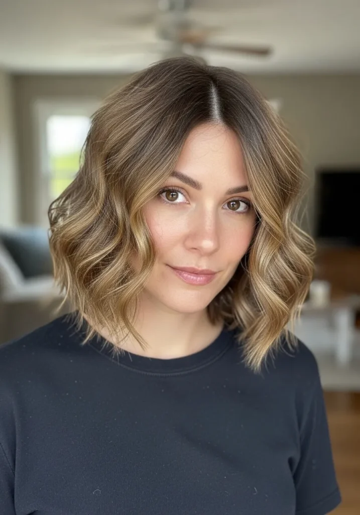 This style features a chin grazing curly bob with soft bends that look effortlessly polished. The middle part keeps everything symmetrical while the loose curls add gentle movement and shape. The color blends warm brunette roots with honey blonde highlights that brighten the face without feeling too bold. The cut has light layering around the ends which helps the curls sit in a fluffy, airy way instead of feeling heavy.