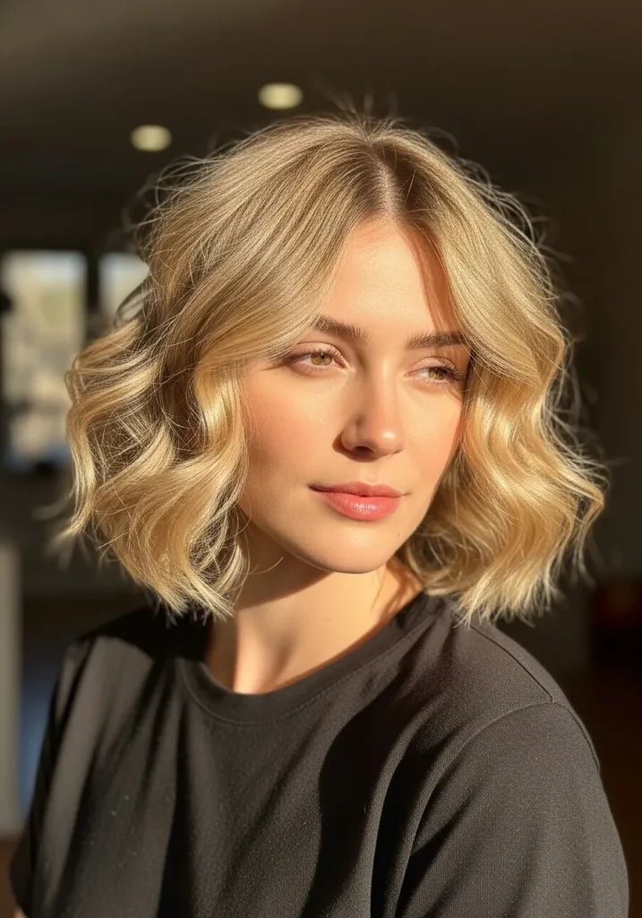 This curly bob sits just above the shoulders with the prettiest loose waves that catch the light in the dreamiest way. The middle part keeps everything balanced while soft layering adds a gently rounded shape that feels effortless and airy. The color is a warm buttery blonde with subtle brightness around the face, and the curls look naturally tousled in that perfectly undone but still polished style we all secretly want without trying too hard.