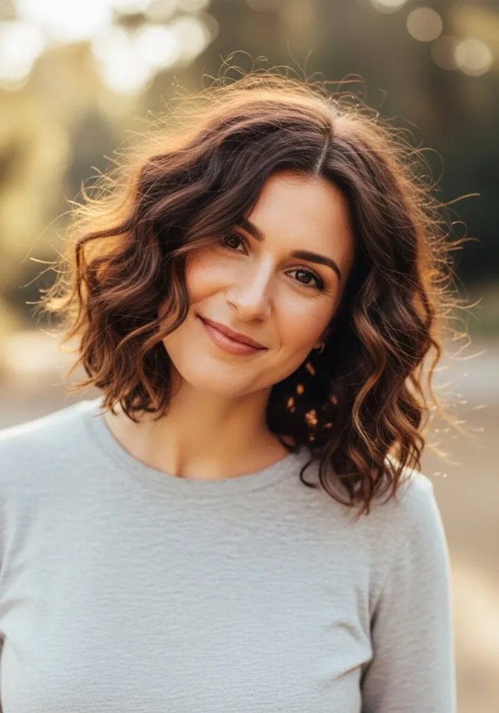 This style is a softly textured curly bob that sits just above the shoulders with loose, airy waves that look naturally tousled. The middle part keeps everything balanced while the subtle caramel highlights add a warm dimension against the deeper brunette base. The layers are light and blended so the curls fall in gentle bends instead of tight spirals which gives the whole look a relaxed and effortless vibe.