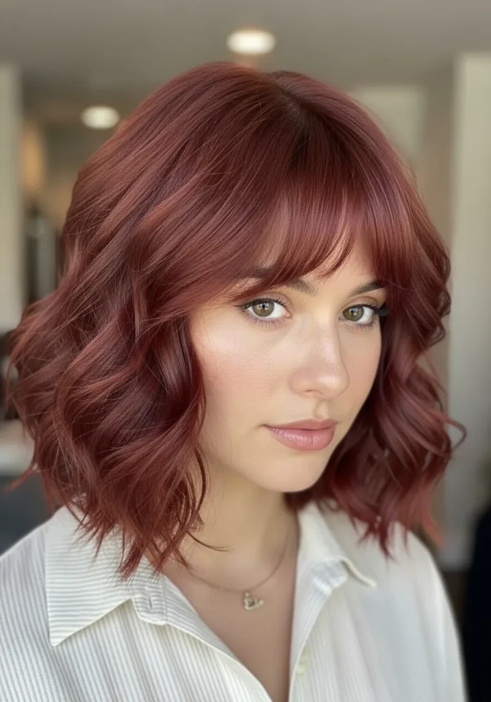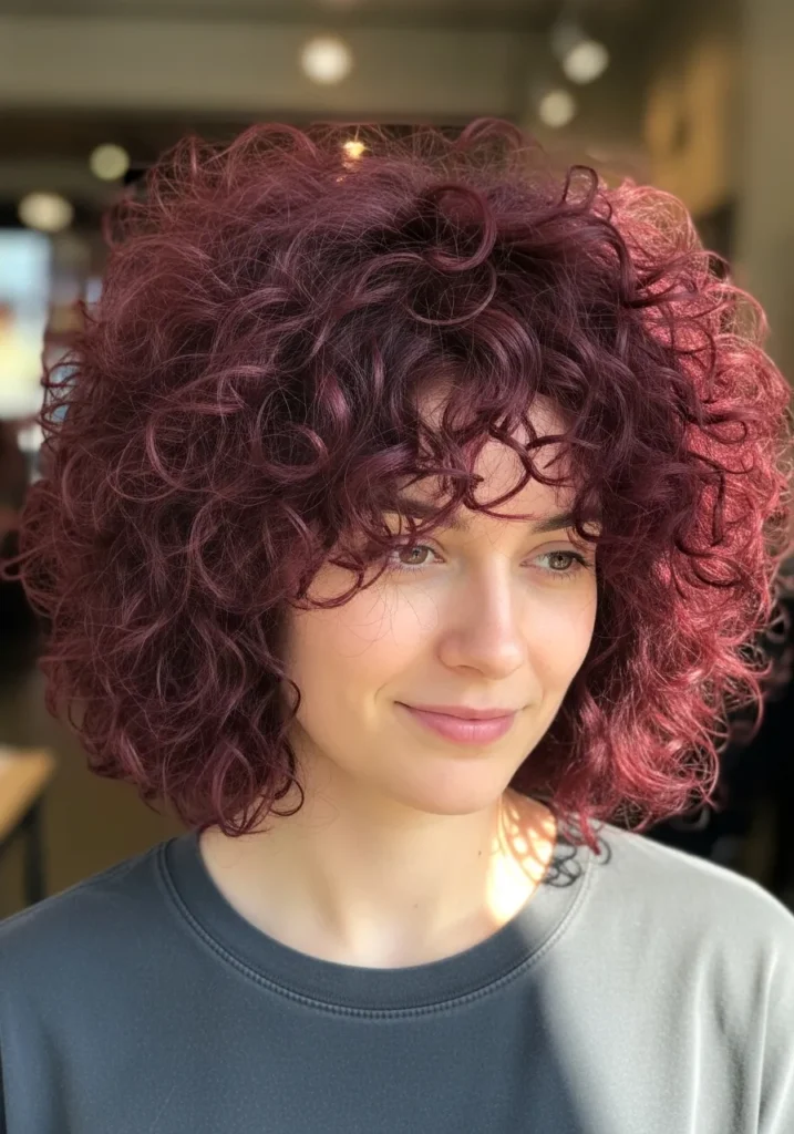 Voluminous Berry Curly Bob With Soft Bangs
