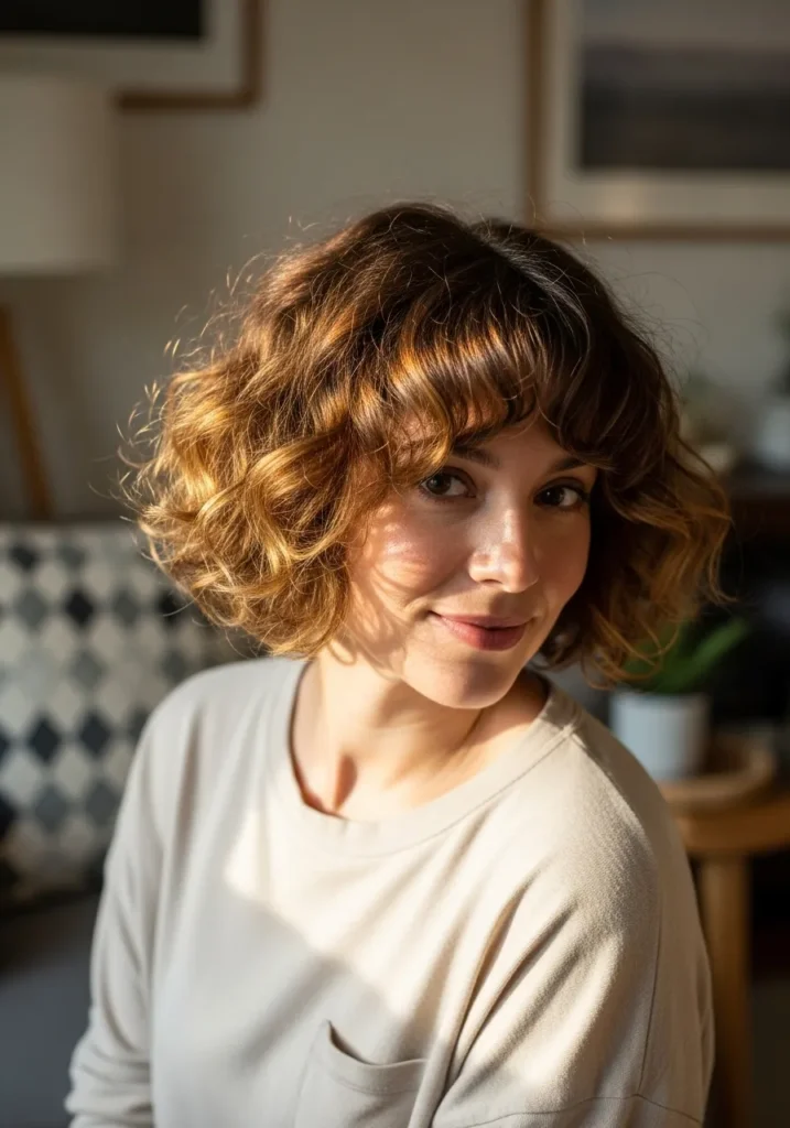 Soft Curly Bob With Warm Sunlit Bangs