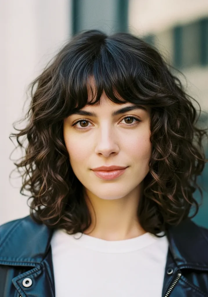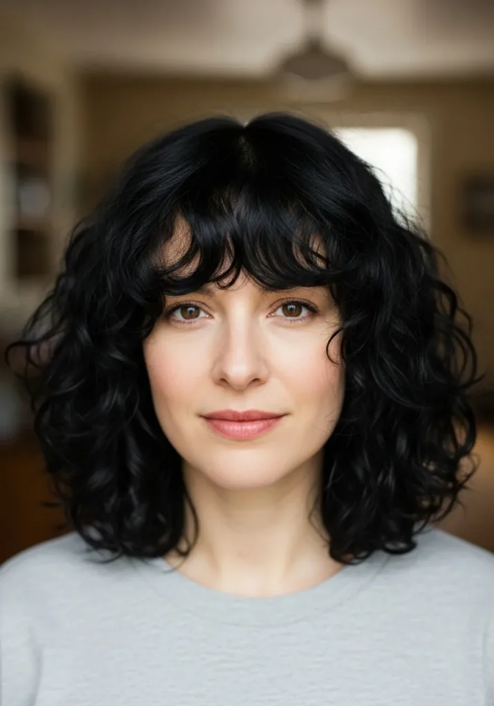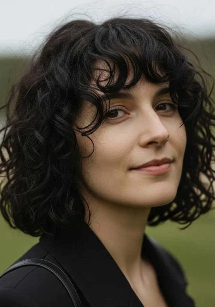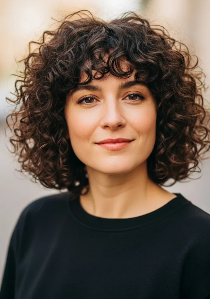 This look shows off a chin grazing curly bob with the prettiest airy texture. The curls are soft and slightly tousled, giving the whole style a natural bounce that feels effortless and chic at the same time. The bangs fall in loose curved pieces that frame the eyes without feeling heavy. The rich dark color keeps everything polished while the subtle layers help the curls lift and move on their own.