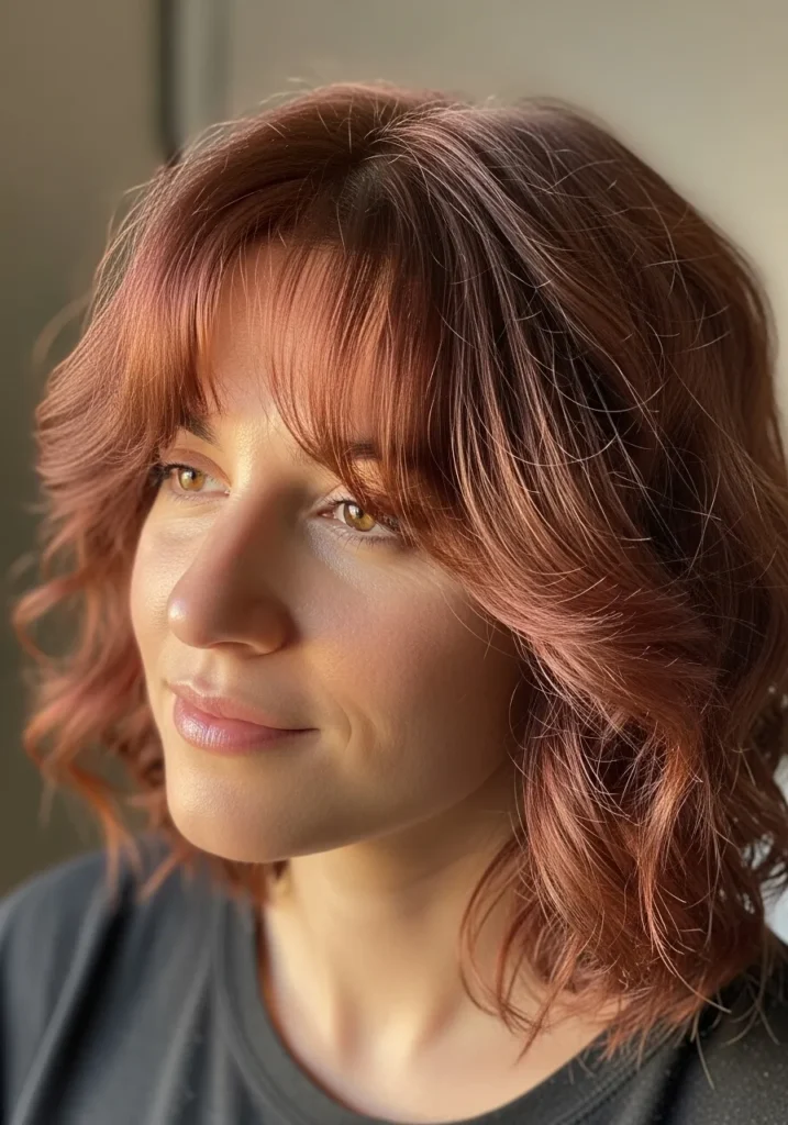 Soft Copper Curly Bob With Feathered Bangs