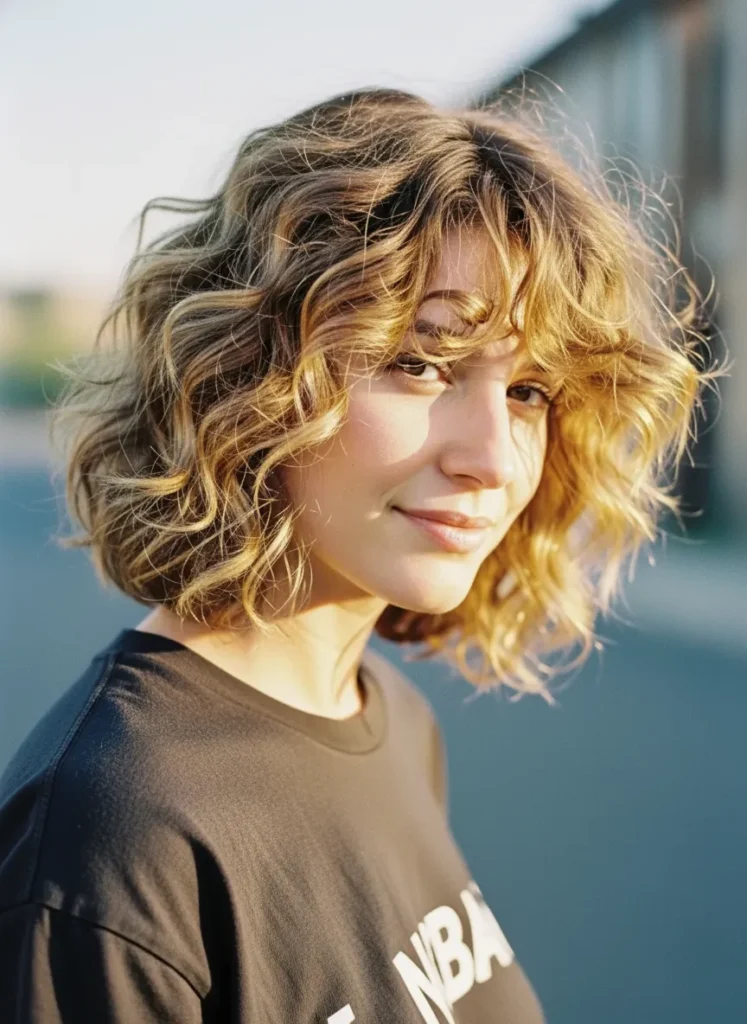 This curly bob sits right at chin length and has that effortless tousled texture everyone secretly wishes they woke up with. The curls are loose and bouncy with soft layering that gives the shape lots of air and movement. Warm blonde highlights are painted throughout the waves and catch the light in the prettiest way so the whole style looks bright and dimensional. The front pieces are gently curved around the face which adds a sweet, airy softness without feeling overstyled.