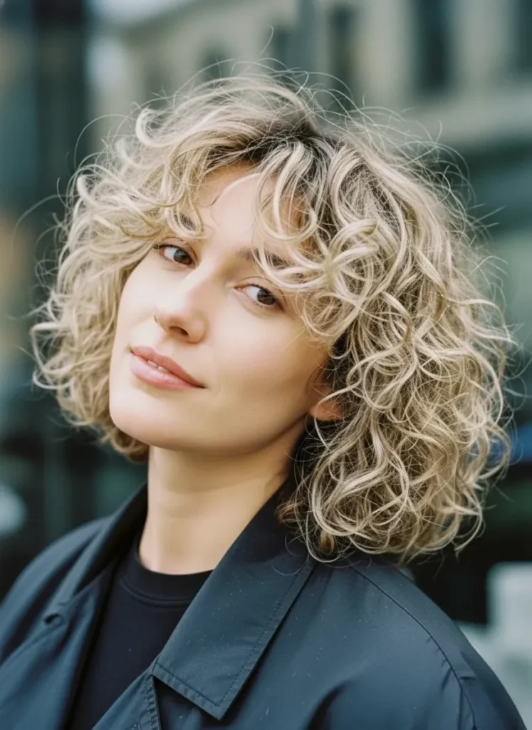 This curly bob sits just above the shoulders and shows off those loose, airy waves that look like they naturally happened during golden hour. The layers are soft and feathered, giving the curls room to bounce without feeling heavy. The color blends warm blonde tones with lighter highlights that catch the light in the prettiest way. Everything about this style feels relaxed and effortless yet still polished enough to look intentional.