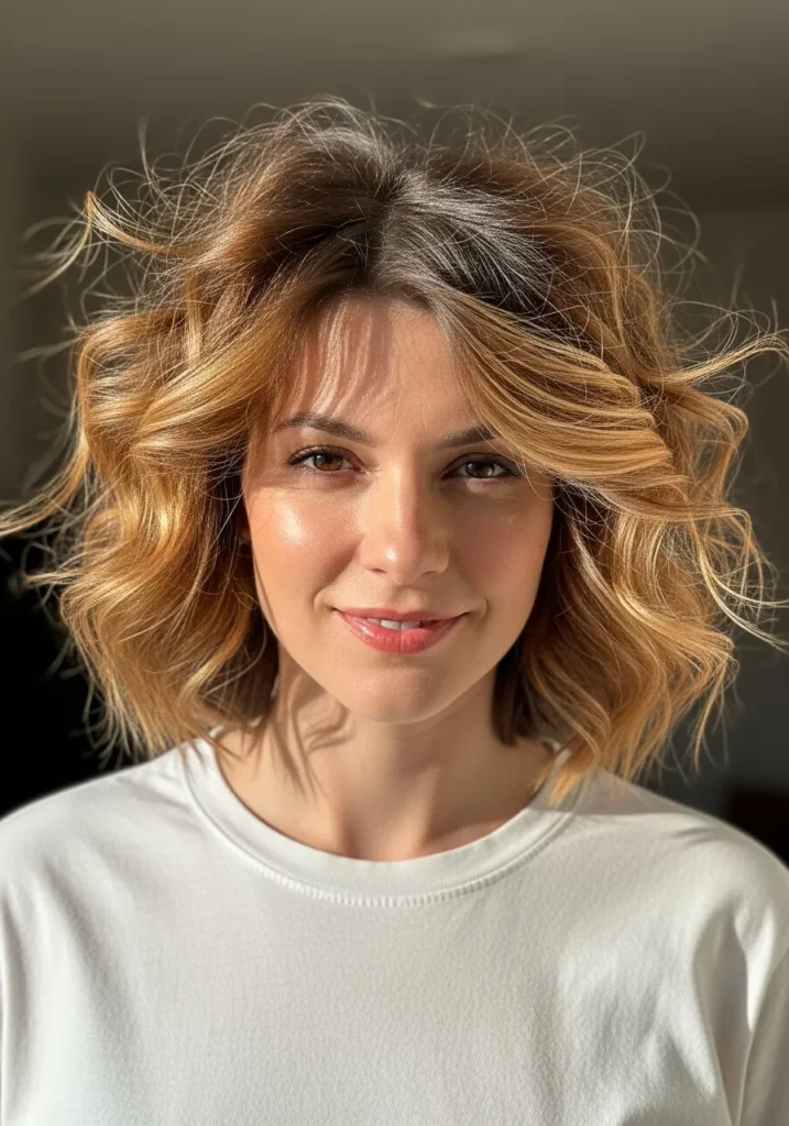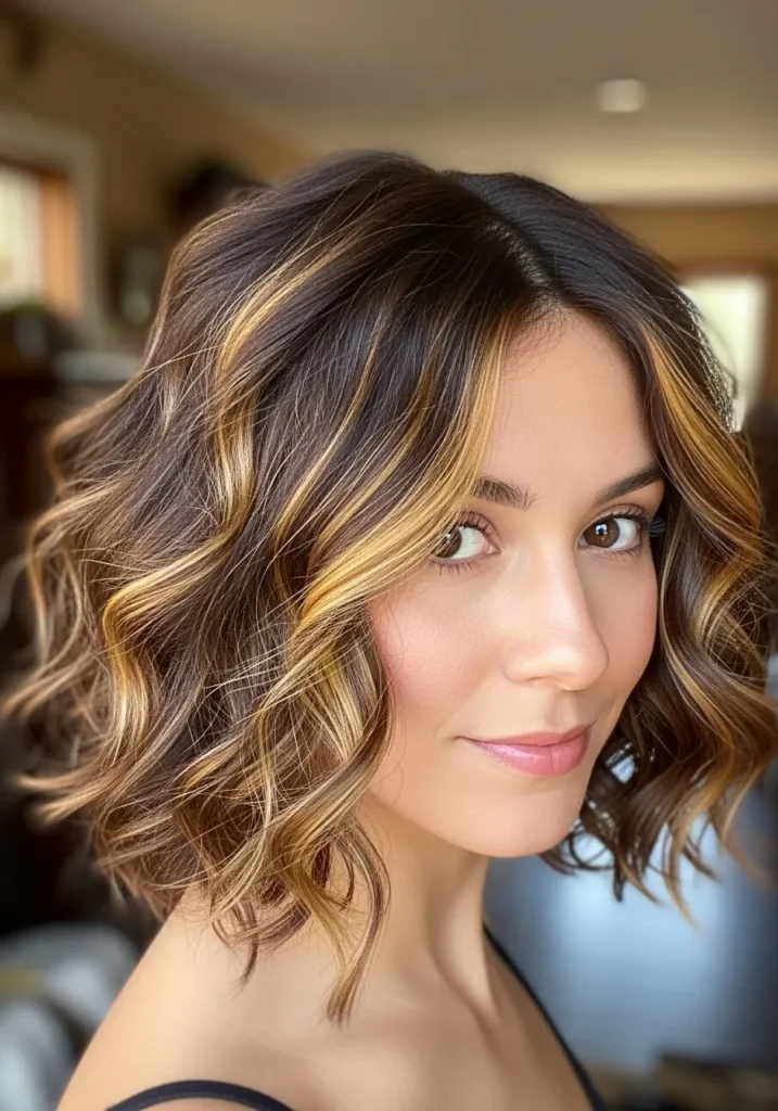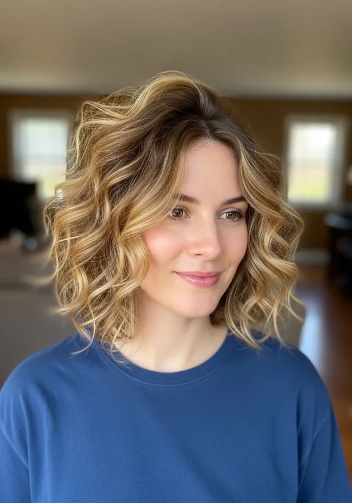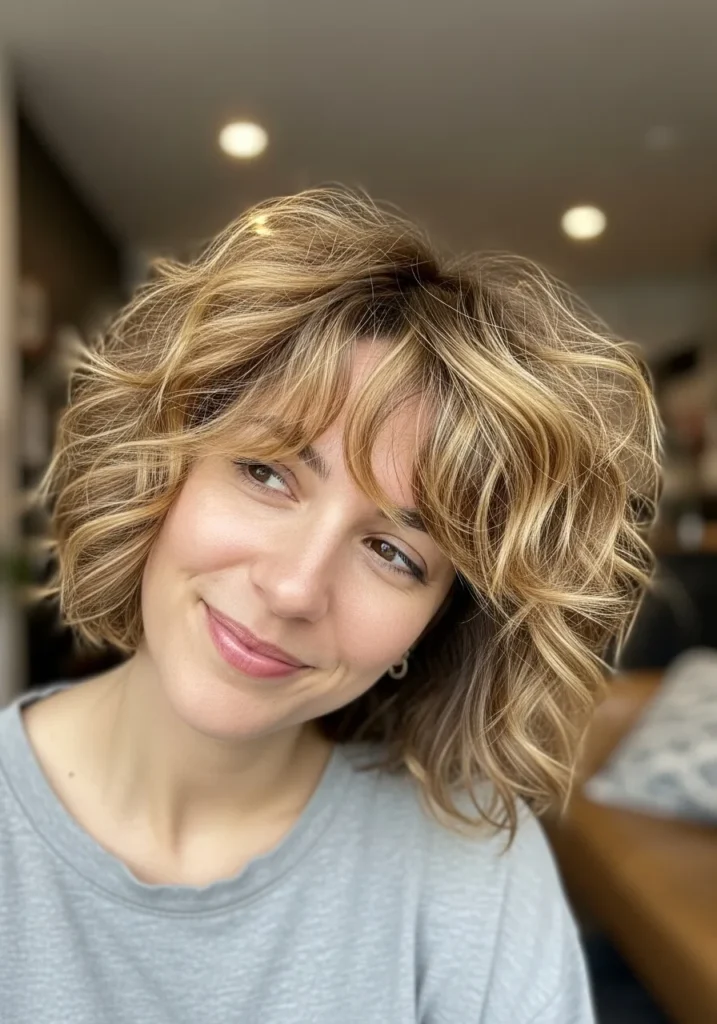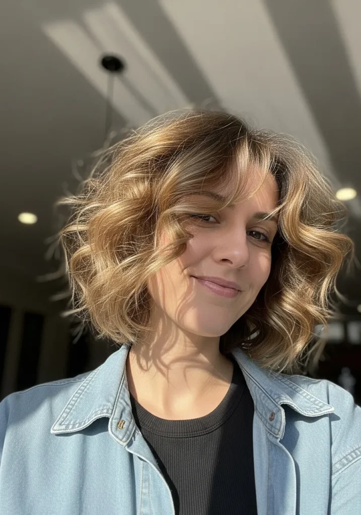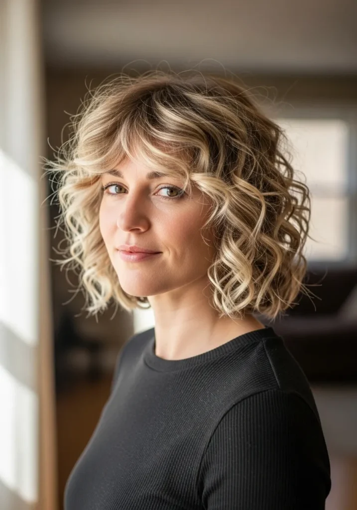 I love how this kind of bob instantly brightens my whole face without needing much styling effort. The layers stop the curls from weighing down and the highlights create that dreamy glow that makes my skin look warmer and softer. It is one of those styles that makes me feel put together even on a low maintenance day which is always a win in my book.