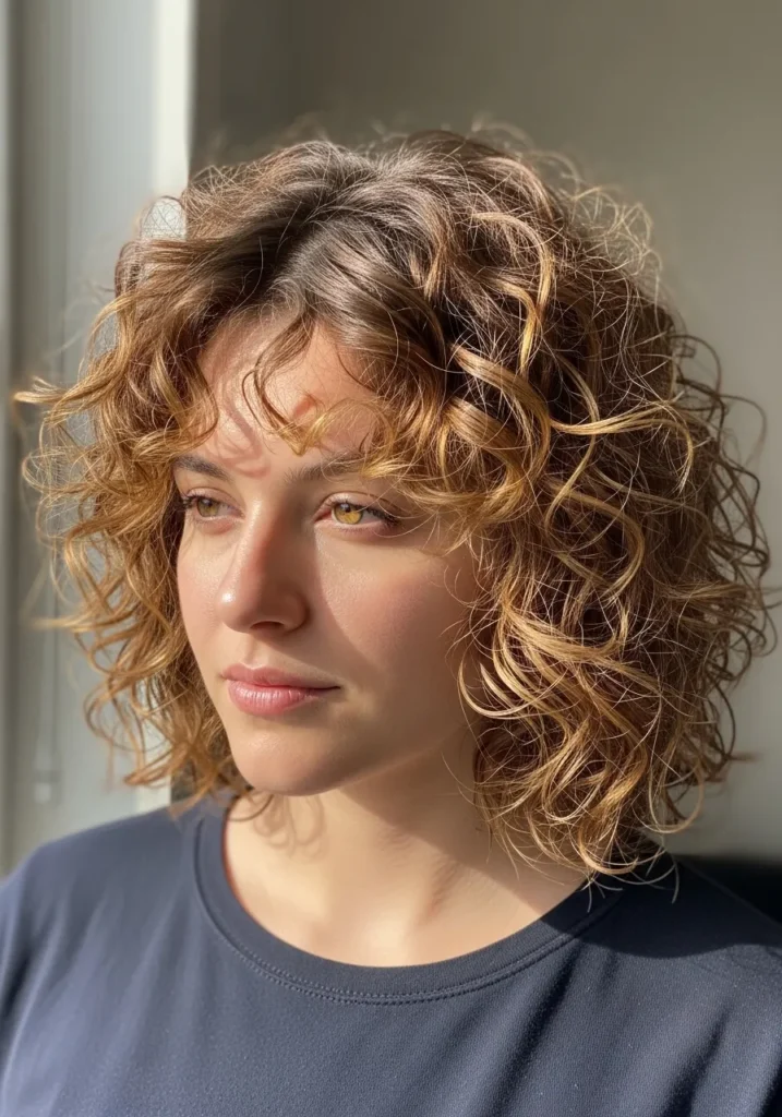 This curly bob sits right at chin level and has that perfect mix of tousled texture and airy movement. The curls are loose and bouncy with light layering that adds lift around the crown and softness around the face. The warm golden highlights brighten the natural base color in such a flattering way and the sunlit finish makes every curl look dimensional and full. The style is relaxed yet polished with those effortless bends that look like you spent the morning on a beach walk instead of in front of a mirror.