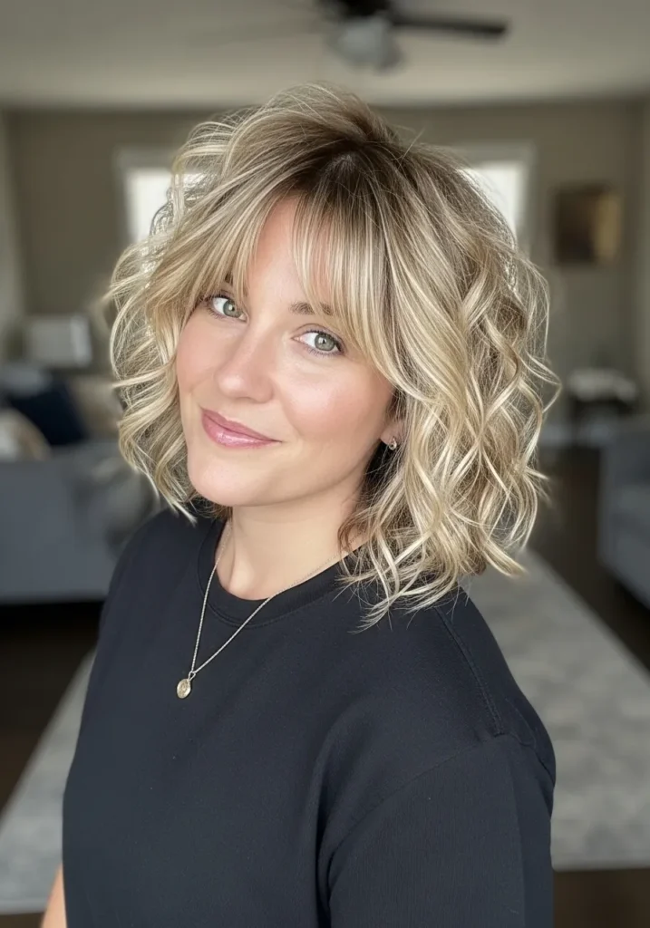 I love how this style instantly makes my face look brighter. The highlights catch the light in the prettiest way and the curls give me that touch of volume I always wish I had. It feels flattering because the layers keep everything from sitting flat while the fringe softens my features. On busy days it still looks charming with almost no effort at all which is always a win for me.