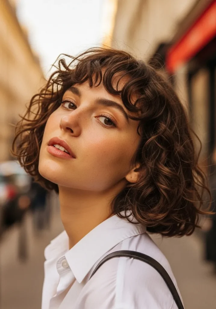 This look blends a softly curved French bob with loose curls that skim just above the shoulders. The texture is airy and natural with gentle bends through the ends that keep everything feeling effortless. The bangs are lightly feathered and sit just above the brows which adds a sweet Parisian softness to the whole style. The warm brunette shade gives the curls a glossy finish and makes the shape feel extra polished without losing that carefree charm.