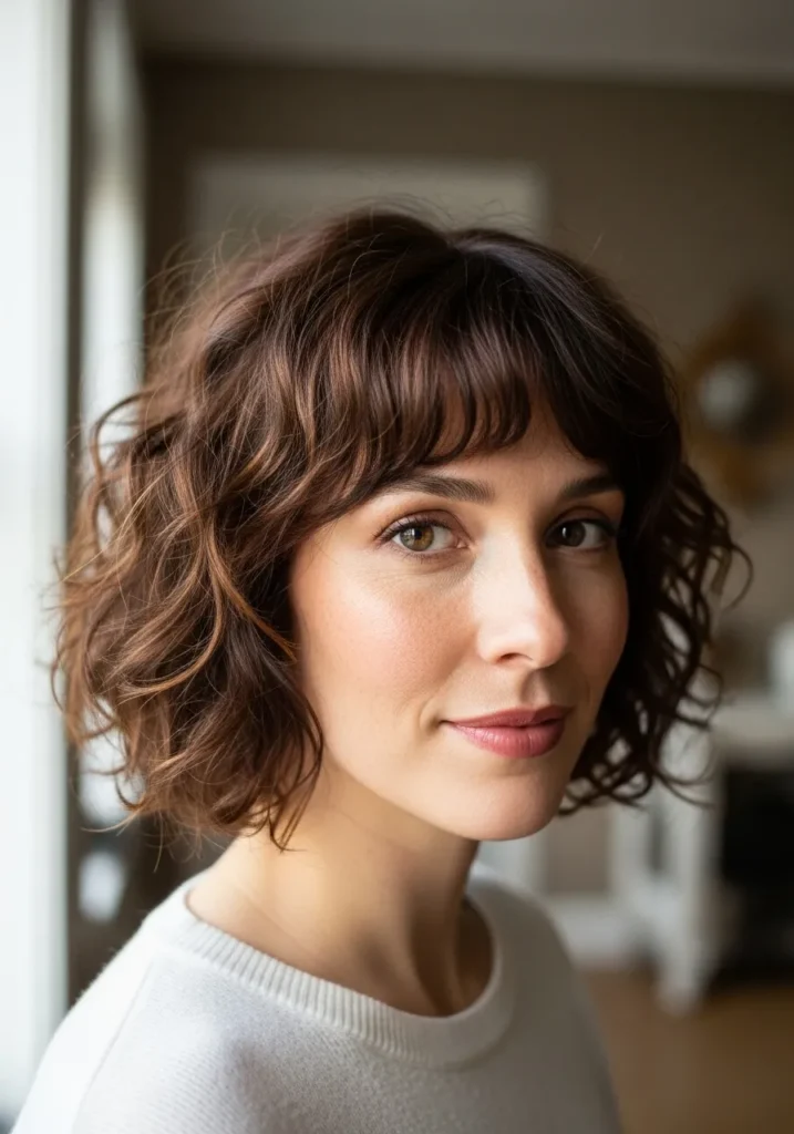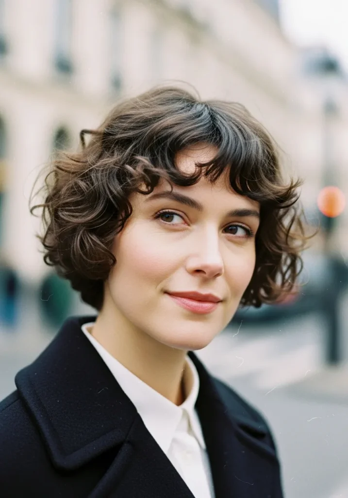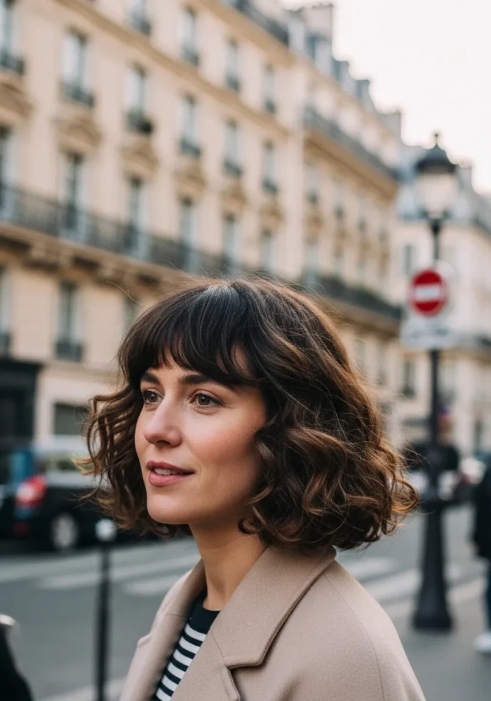This look shows off a softly rounded curly bob that sits right at the jawline with the prettiest natural movement. The curls are loose and airy with just enough definition to feel polished without losing that carefree French charm. The bangs are lightly feathered and skim the brows in a subtle curve that blends gently into the sides. The warm chocolate brown shade makes the whole cut feel cozy and flattering in that effortless Paris street style kind of way.