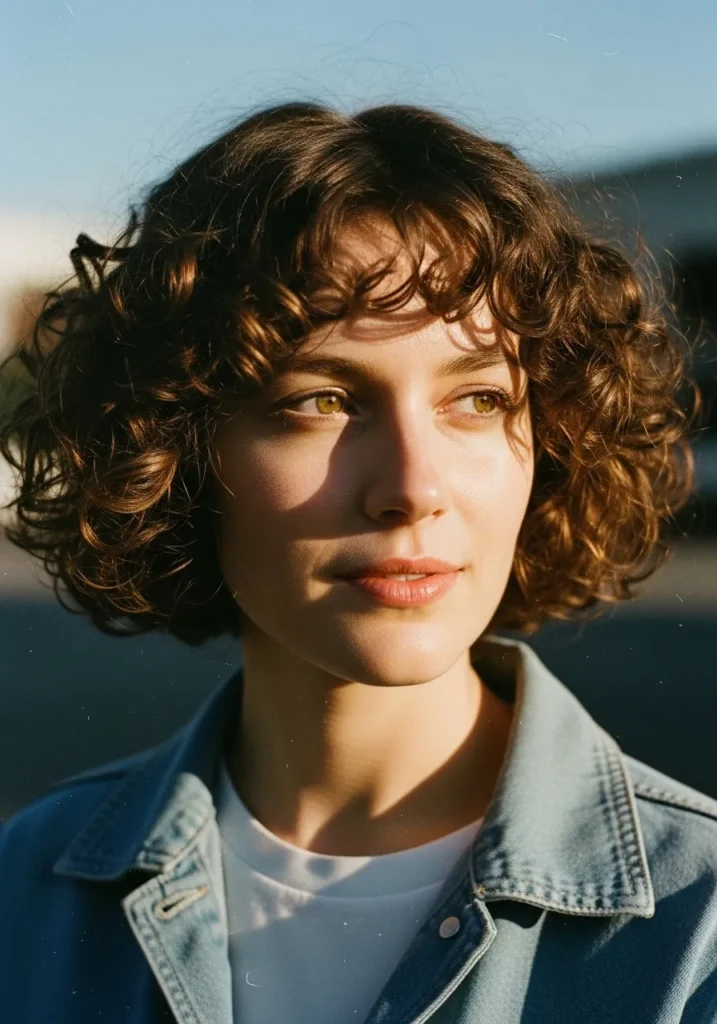 This curly French bob sits just above the jawline and feels effortlessly airy. The curls are soft and springy with a natural, light texture that catches the sunlight beautifully. The shape is rounded with subtle layering that gives the whole cut a gentle bounce. The color leans toward a warm medium brown that looks extra glossy in natural light. The baby fringe adds a sweet Parisian touch with tiny curls that frame the forehead in the softest way.