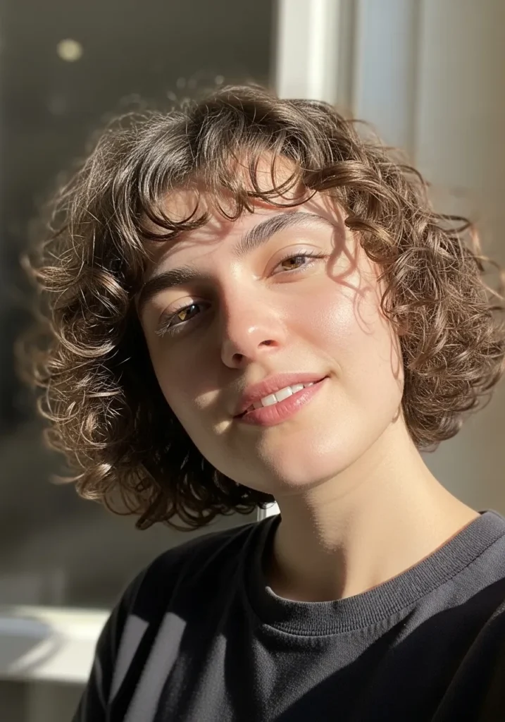 This style is a short and choppy curly French bob that sits right at the jawline with a breezy, rounded shape. The curls are soft and springy with a mix of tighter twists and looser bends that keep the whole look playful. Light micro bangs skim the forehead with a feathery texture that blends into the rest of the curls. The color is a warm medium brown with natural looking golden highlights that brighten the curls and make them pop without feeling overdone.