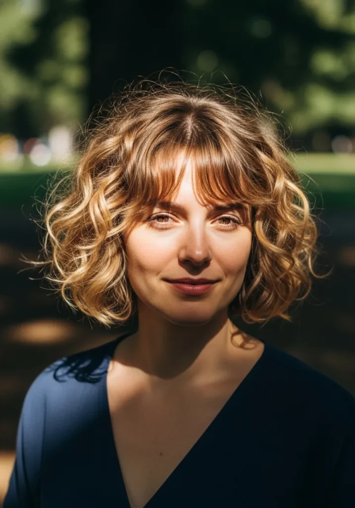 Sunlit Curly French Bob With Soft Spiral Bangs
