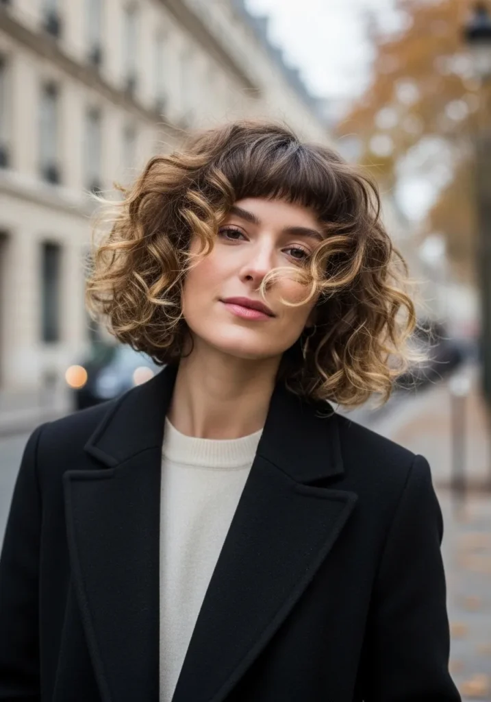 This curly French bob sits right at chin level with a soft rounded shape that feels effortlessly chic. The curls are loose and bouncy with a mix of tighter spirals and airy waves that create that perfectly undone texture. The color blends warm brunette roots with lighter honey curls toward the ends that catch the light in the prettiest way. The mini fringe is short and slightly curved, giving the whole look a playful touch without losing that classic Parisian elegance.