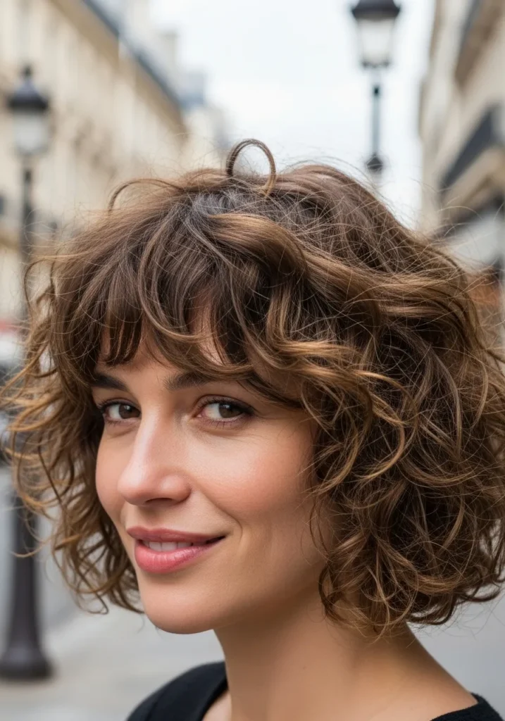This curly French bob sits just above the shoulders with a soft rounded shape that feels airy and natural. The curls are springy and well defined with a slightly tousled texture that makes the whole style look effortlessly chic. Light layers keep everything bouncy while the warm brunette color adds a gentle glow. The soft curly fringe blends into the rest of the bob in a way that feels relaxed and very French apartment morning vibes.