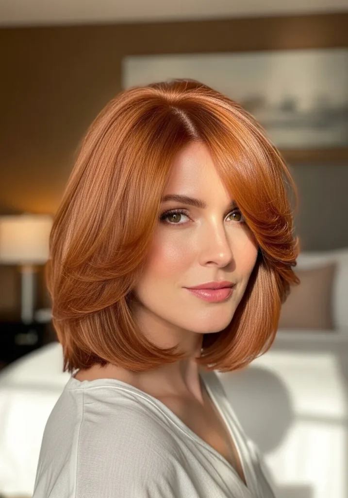 This long bob shows off a gorgeous shoulder-skimming length with softly feathered layers that frame the face in the prettiest way. The texture is smooth and airy, giving the whole look that effortless bounce you usually only get after a salon blowout. The rich copper color warms up the style even more, catching the light with a subtle glow that feels cozy and luxurious at the same time. Everything about this cut feels polished yet totally wearable for everyday life.
