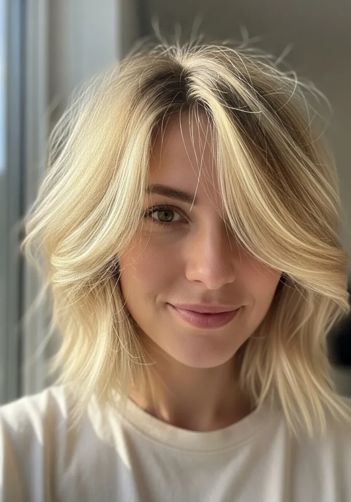 This soft feathered blonde lob hits just above the shoulders with airy layers that float around the face. The texture feels light and wispy with those perfectly undone ends that look like they styled themselves in the best way. The color is a warm buttery blonde with subtle highlights that catch the light and make the whole cut feel bright and fresh. The long side pieces softly curtain the eyes which gives the style that sweet mix of cute and a little flirty.
