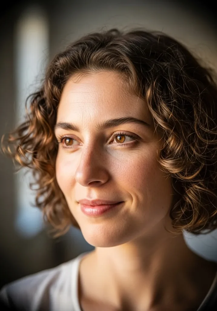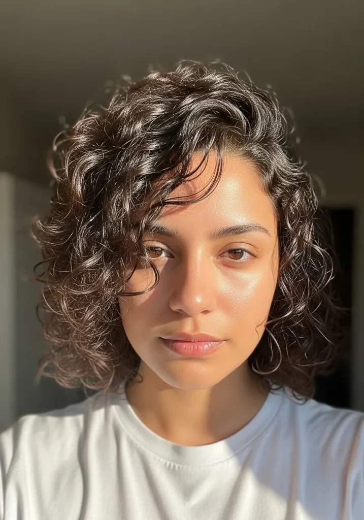 This bouncy curly bob falls just below the ears, creating a lively and playful look. The curls are soft yet defined, with natural volume that adds a touch of charm. Sunlight beautifully highlights the hair, adding a golden touch to the dark curls, while the soft framing around the face enhances its natural beauty.