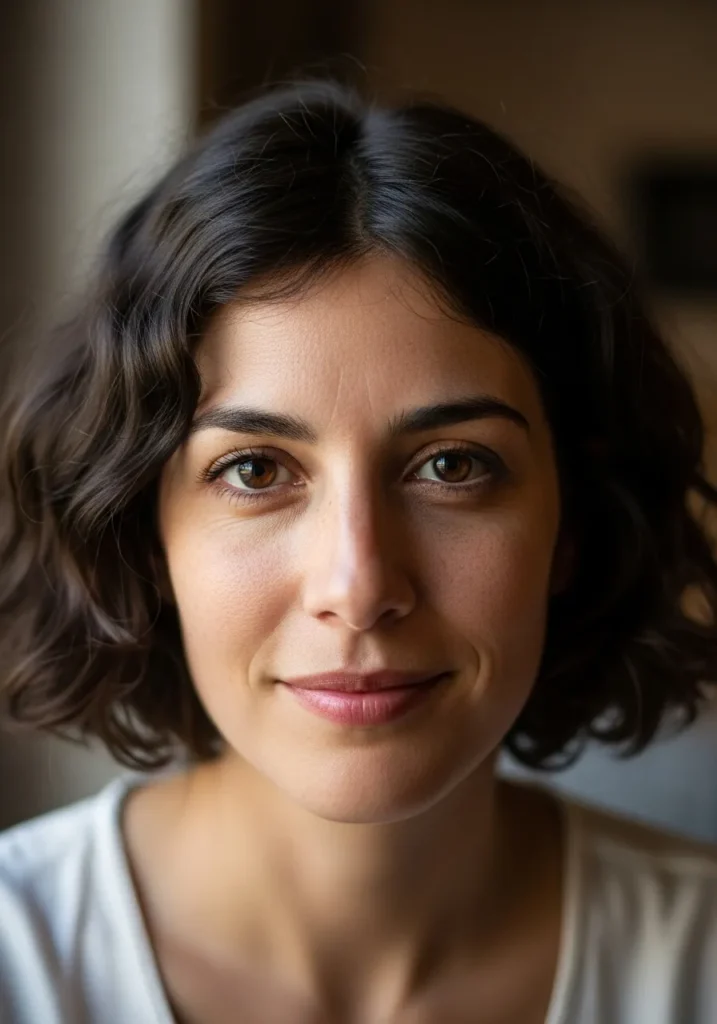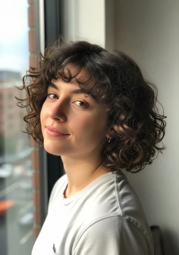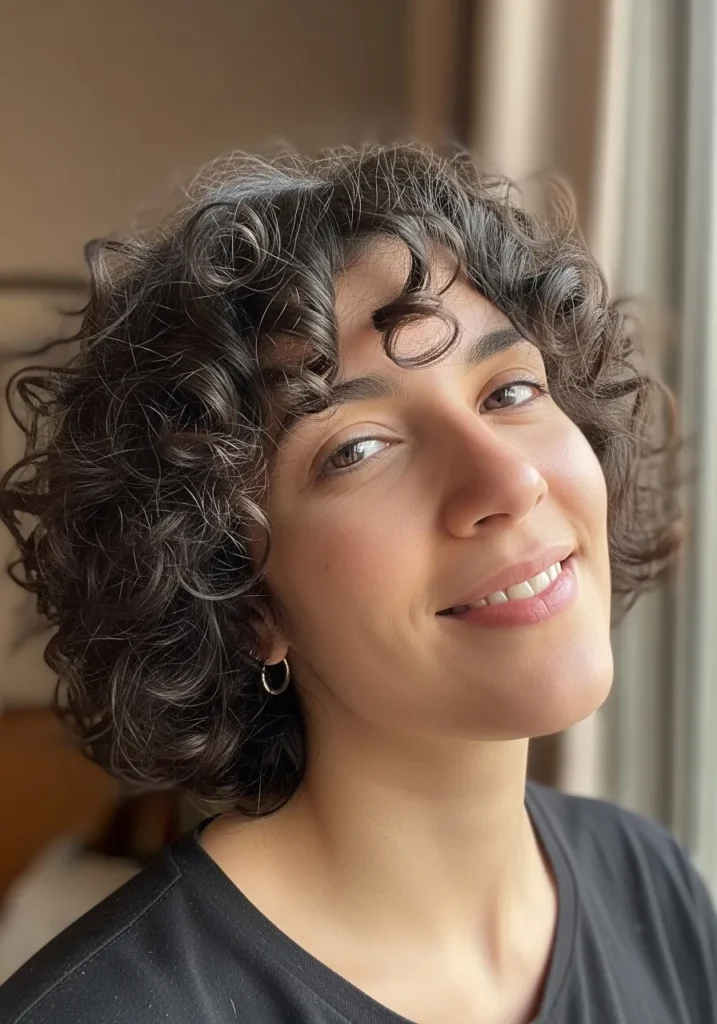 A curly bob with natural, voluminous curls that create a lively and youthful vibe. The hair has a bounce that catches the light and adds dimension, while the style remains effortlessly chic.